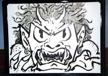 お寺の中には衝立に鬼のイラスト、ふすまには鬼の似顔絵などがありこれらすべてをいわみさんに描いていただいております。その紙芝居の原画を元にホームページの紙芝居を制作しました。